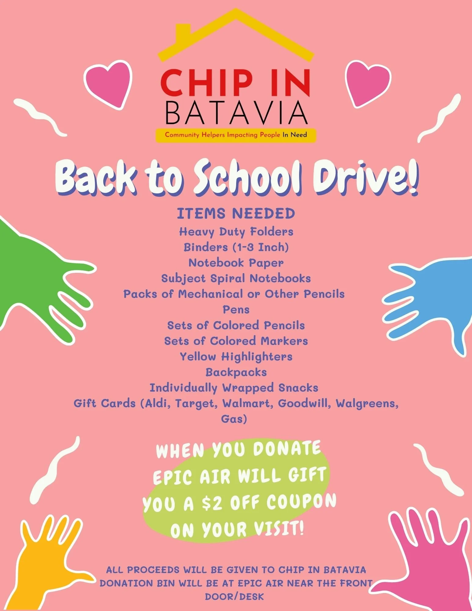 Each Batavia District School has a point person with a CHIP IN Batavia representative assigned. Church groups, Batavia Woman's Club, Batavia Mother's Club, businesses, and other groups and individuals aid the CHIP IN representative when needs arise.